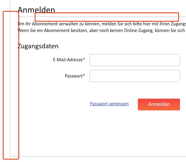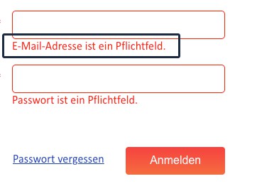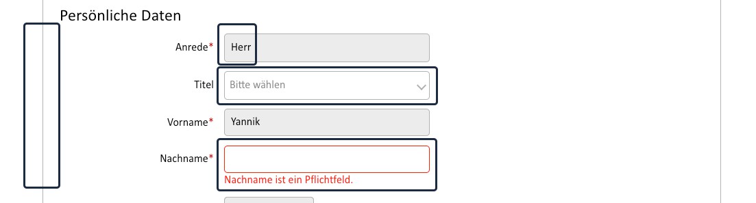 Der Text "Persönliche Daten" sowie "Zugangsdaten" weist nicht den minimalen Kontrast von 4,5:1 auf. Der Text "Persönliche Daten ändern" weist nicht den minimalen Kontrast von 4,5:1 auf. Der Text "Frankreich" in Hover Zustand weist nicht den minimalen Kontrast von 4,5:1 auf. Der Text der Fehlermeldung weist nicht den minimalen Kontrast von 4,5:1 auf (der Border selbst ist Konform). Der Border unterhalb "Zugangsdaten" weist nicht den minimalen Kontrast von 3:1 auf. Der aktive "Persönliche Daten ändern" Button weist zum Hintergrund nicht den minimalen Kontrast von 3:1 auf (Verlauf an der orangenen Seite). Der deaktivierte "Persönliche Daten ändern" Button weist zum Hintergrund nicht den minimalen Kontrast von 3:1 auf. Der graue Hintergrund des ausgewählten Punktes "Deutschland" im Accordion weist zum weißen Hintergrund, als auch zum grauen Border, als auch der Border zum weißen Hintergrund, nicht den minimalen Kontrast von 3:1 auf. Die deaktivierte Eingabefelder wie z.B. "Vorname" weist zum Border, sowie der Border selbst zum weißen Hintergrund, nicht den minimalen Kontrast von 3:1 auf. Die Border der Eingabefelder/Accordions weisen zum weißen Hintergrund nicht den minimalen Kontrast von 3:1 auf. Der Border der gesamten Persönlichen Daten Seite weist nicht den minimalen Kontrast von 3:1 auf. Der Border der Checkbox weist nicht den minimalen Kontrast von 3:1 auf.